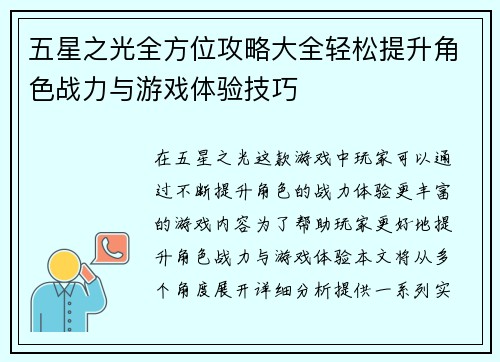 文章摘要:在《洛克王国》这款充满冒险与挑战的游戏中,提升宠物的实力一直是玩家追求的目标。宠物的实力与其努力值息息相关,合理提升努力值将对宠物的战斗力产生决定性影响。本文将从四个方面详细解析如何高效获取努力值,从而提升宠物的综合实力。首先,我们将探讨通过高效的战斗获取努力值;其次,介绍利用道具的方式来...